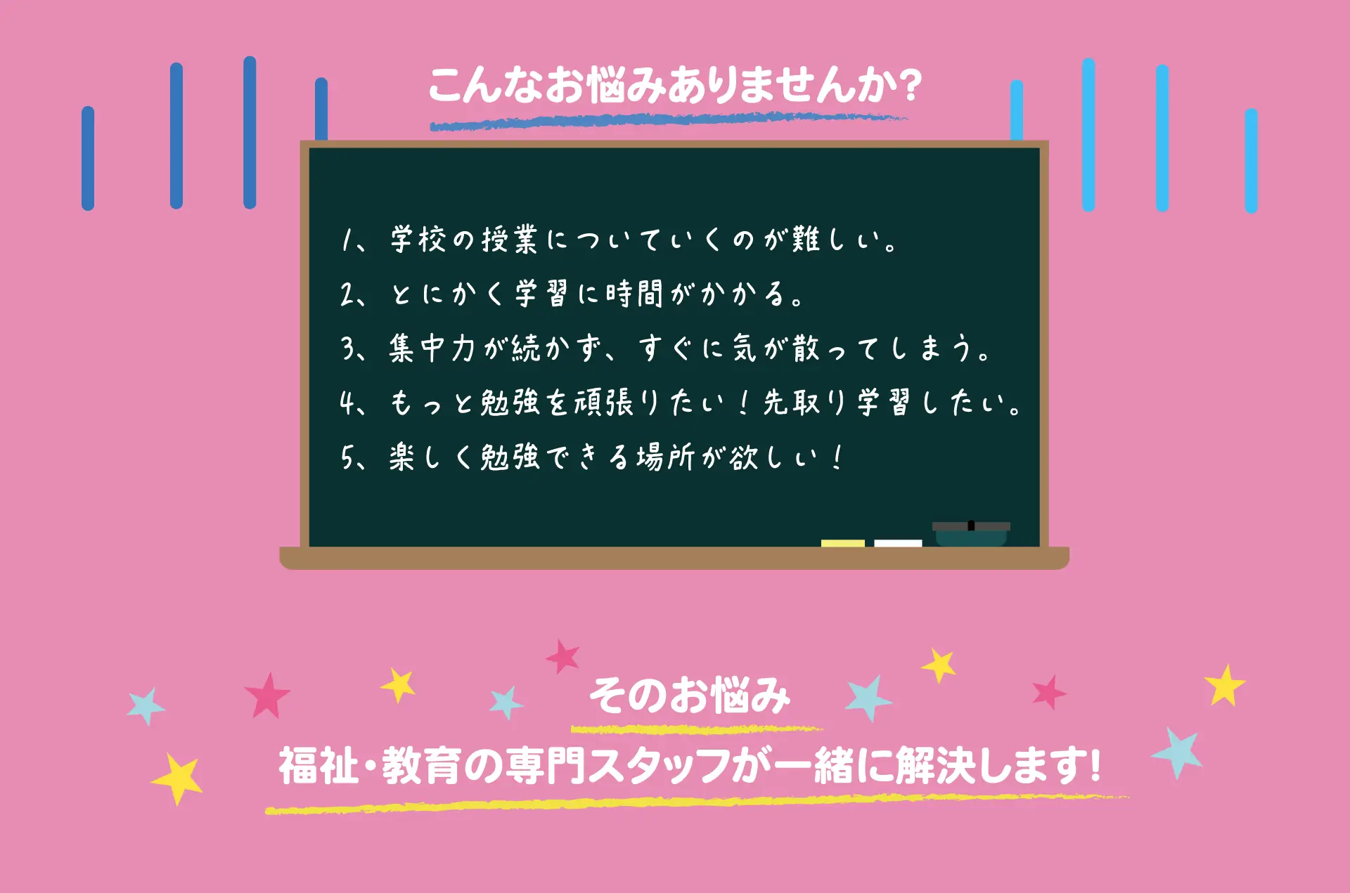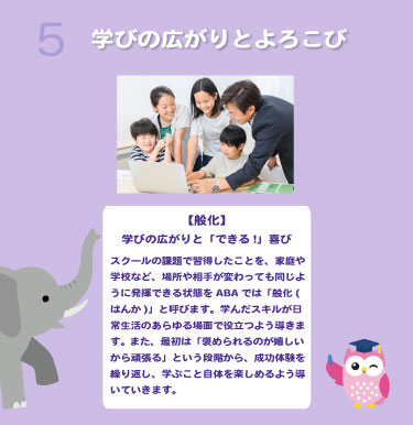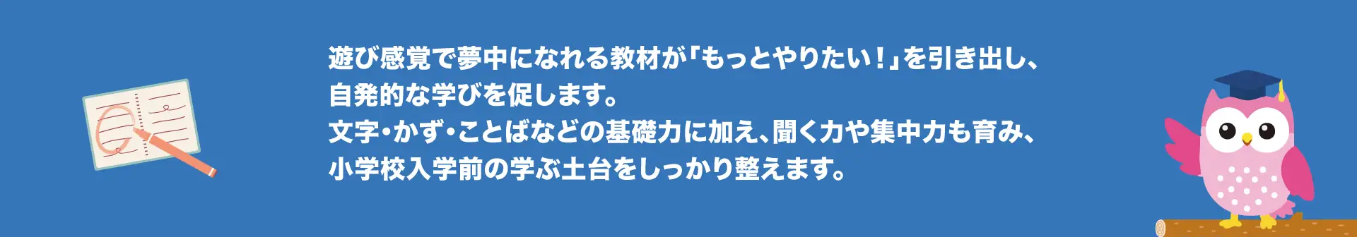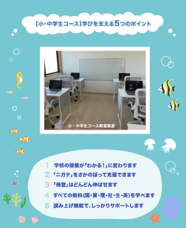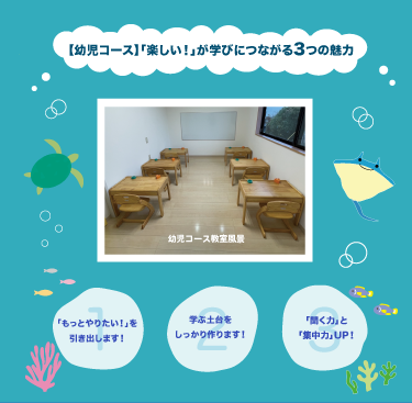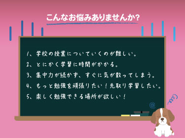 幼児(3 歳)から中学生までのお子様が対象です。 診断の有無は問いません。 「学校の勉強につまずきを感じる」「集団が苦手」など、学びや発達に関して気になることがあるお子様、どんどん先取り学習をしたいというお子様、全てのお子様にご利用いただけます。