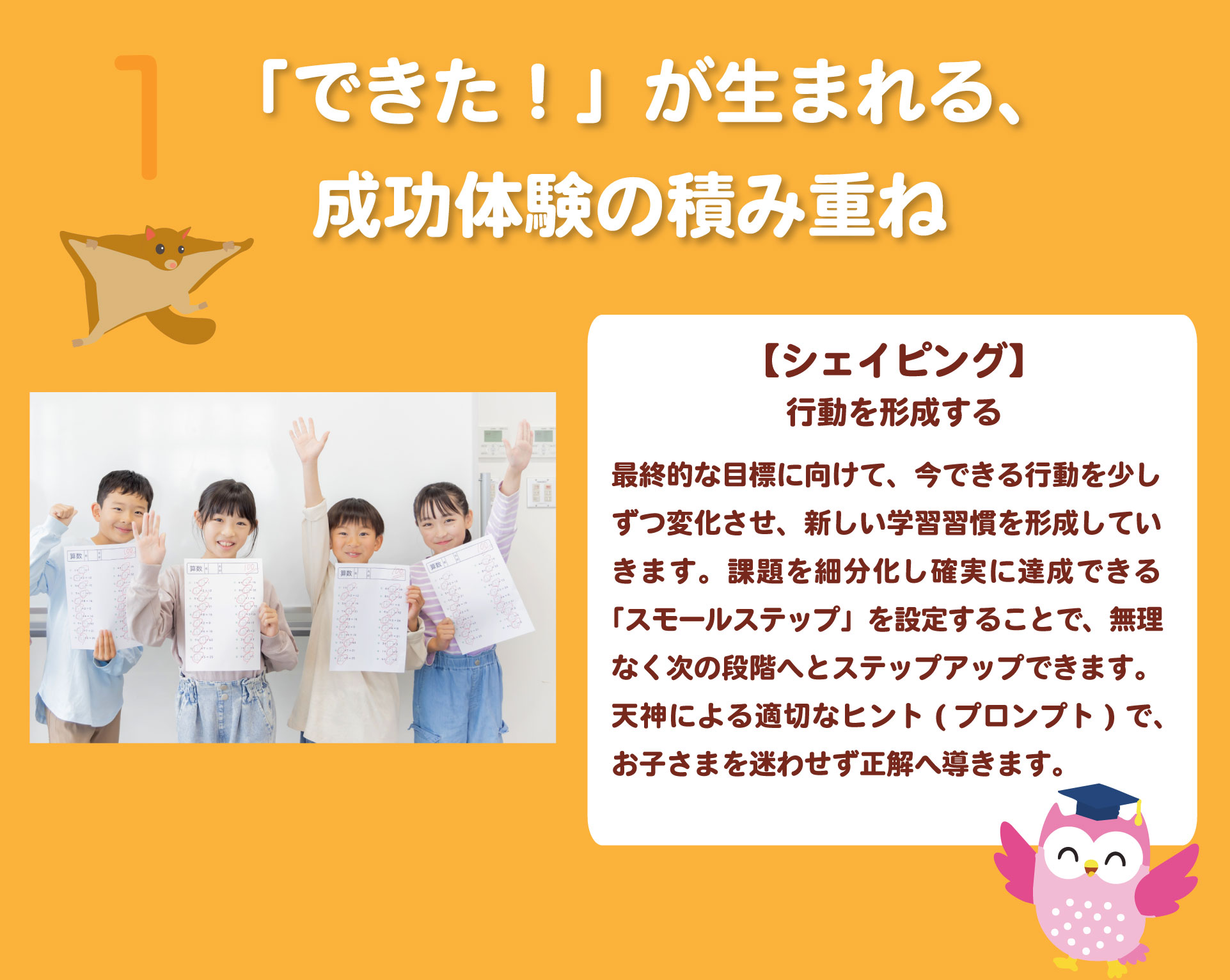 ご提案内容にご納得いただけましたら通塾スタートです。 「できた!」を積み重ね、自信を育てていきましょう。