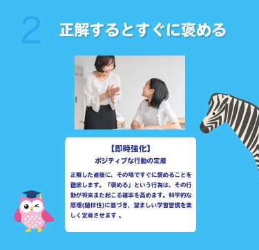 一人一人の得意、苦手を分析し、ICT教材天神を使い、お子様にちょうど良い課題を出願し、できたを積み重ねていきます。スタッフは、「ほめる」ことを中心に進めます。無理やりやらせるのではなく、お子さまが自ら「やりたい!」と思えるような、課題設定を何よりも大切にしています。